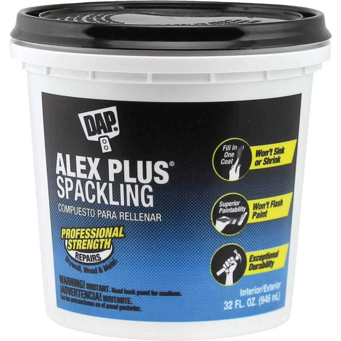 Professional strength Alex Plus Spackling provides unsurpassed performance for filling holes and cracks in surfaces such as drywall, plaster, wood, brick, metal, and stone. Ready-to-use smooth white latex polymer formula spreads easily for fast, professional repairs that will not sink, shrink, or crack. Superior paintability, will not flash paint. Exceptional durability. Sandable. Interior/exterior use. Easy water clean-up.