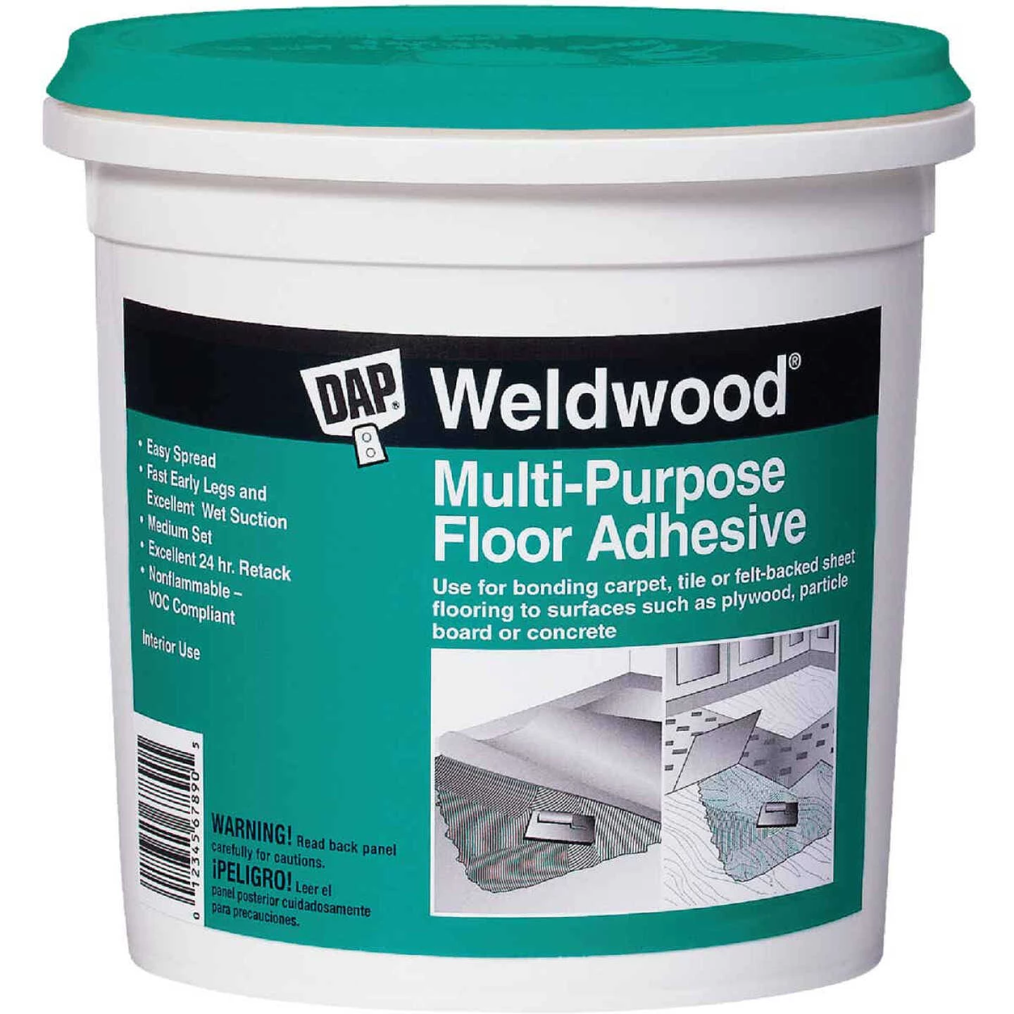 Latex based adhesive. Allows easy repositioning of floor coverings during installation. Water-resistant. Use over dry above or below grade concrete, flooring grade plywood or particle board, for installing felt backed sheet goods, vinyl composition tile (VCT), cork or rubber tile, and carpeting backed with jute. Not to be used for solid vinyl, vinyl-sheet goods, and open cell urethane-backed carpeting. Coverage: 18 – 22 sq. yd. per gallon on sheet good, VCT tile, smooth backed carpet. 12 – 16 sq. yd. per gallon on textured backed carpet. Freeze/thaw stable, nonflammable and VOC compliant. Color: Off-white. Plastic pail.